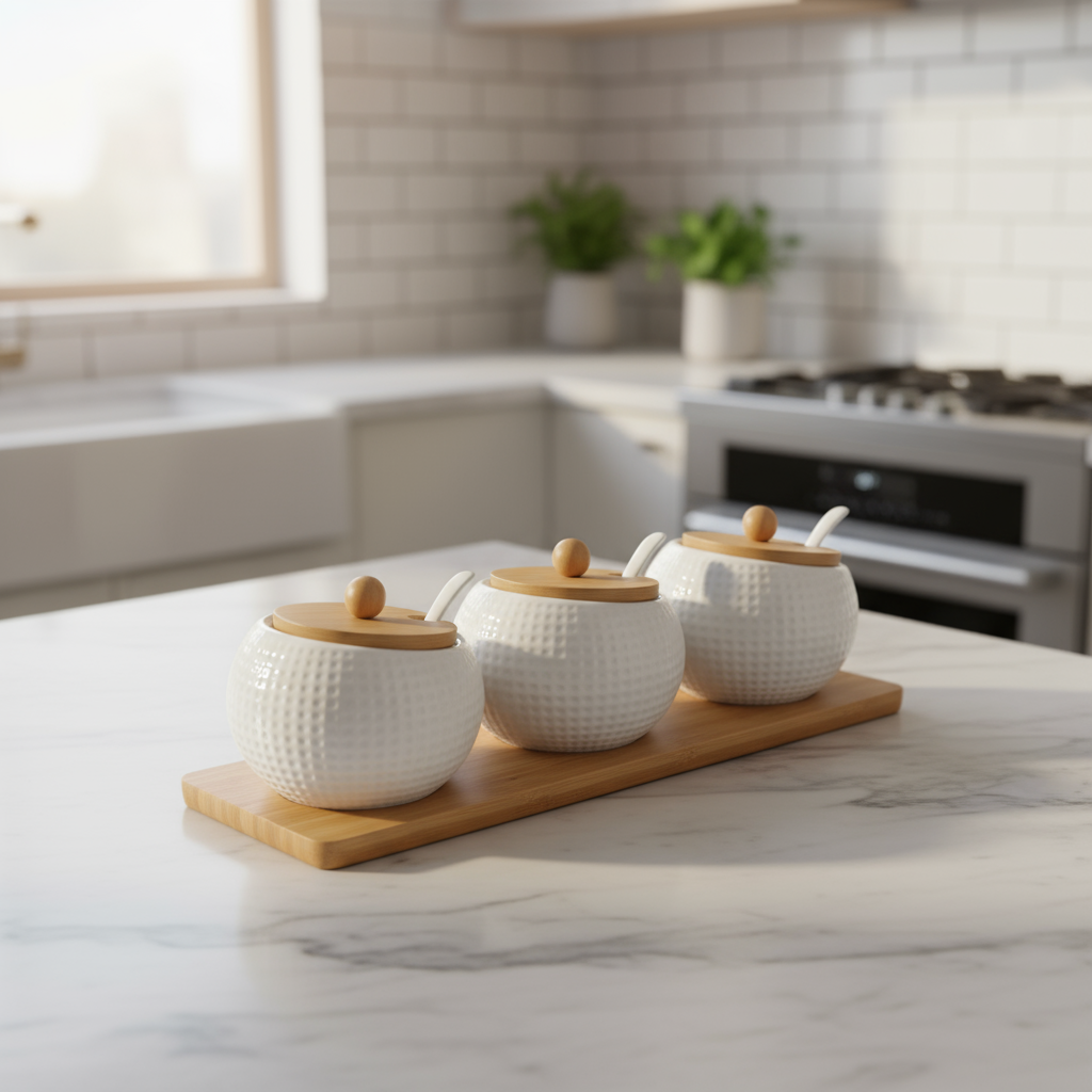 Add a touch of elegance to your kitchen with this beautifully crafted 3-piece ceramic spice jar set. Featuring round, textured white jars with natural bamboo lids and decorative knobs, each jar comes with its own ceramic spoon and sits neatly on a matching bamboo tray. Perfect for storing and serving sugar, salt, spices, or coffee.