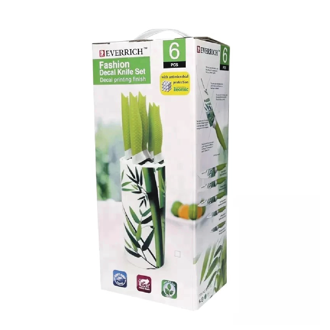This elegant knife holder set features a white cylindrical block decorated with vibrant floral artwork, paired with sleek silver-tipped knives. The universal insert securely holds the knives in place, offering both safety and convenience for everyday cooking. Its refined design makes it a decorative and functional addition to any kitchen, combining practicality with a fresh, artistic touch.