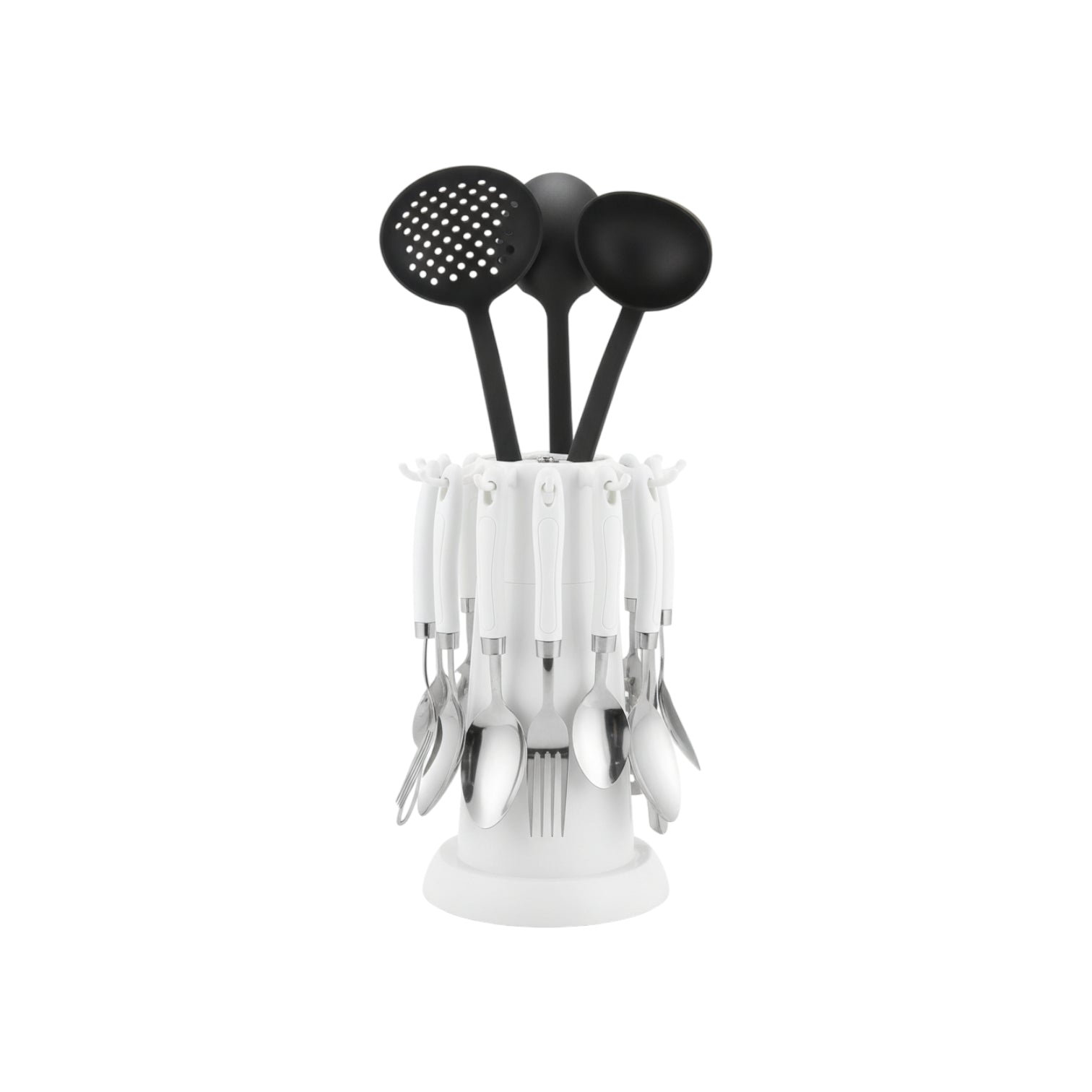 Revolutionize your kitchen setup with the comprehensive Tansung 17-Piece Utensil and Cutlery Set. This all-in-one collection combines essential cooking tools with a full cutlery service, all beautifully organized on a space-saving rotating stand. The sleek white and black design brings a modern, clean aesthetic to any countertop.